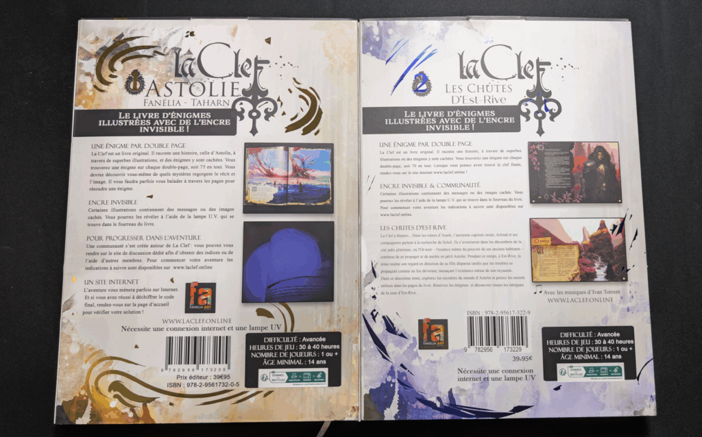 La Clef est une série de livres-jeux d’énigmes innovante, créé par Fanélia et Taharn, édité par Fanélia Art. Distinguée par le Grand Prix du Jouet : Prix Spécial du Jury 2022, Les lecteurs évoluent dans un univers de Dark Fantasy avec à un concept unique : l’utilisation d’encre invisible. Pour résoudre les énigmes, une lampe UV( fournit) révèle des indices cachés dans les illustrations, transformant chaque lecture en une véritable investigation.