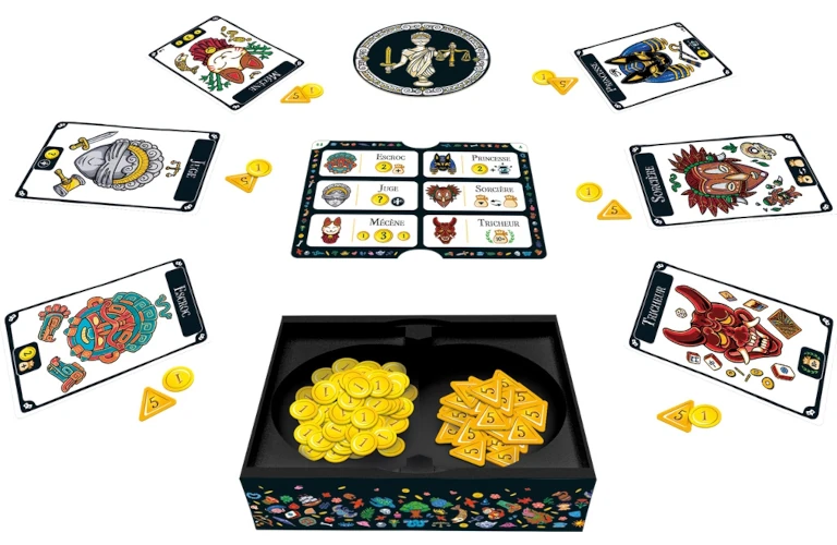 Dans Mascarade, chaque joueur a un personnage secret avec un pouvoir pour gagner de l’argent, mais les cartes sont constamment échangées face cachée, et très vite plus personne n’est sûr de son propre rôle. À votre tour, vous annoncez un personnage pour utiliser son pouvoir : si personne ne vous conteste, vous l’activez, mais si un autre joueur prétend être le même personnage et a raison, c’est lui qui en profite et vous payez une amende. Le premier à amasser 13 pièces d’or grâce à ses bluffs et ses déductions remporte la partie.