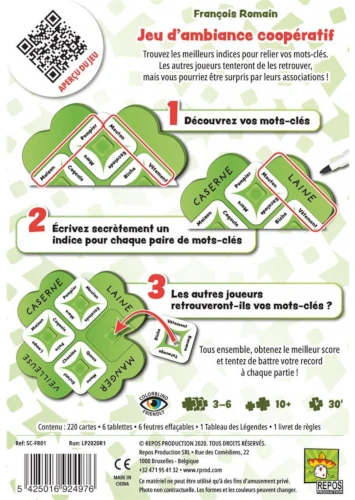 Chaque joueur reçoit une tablette en forme de trèfle à quatre feuilles et quatre cartes de mots-clés qu’il place sur sa tablette, créant ainsi quatre paires de mots.