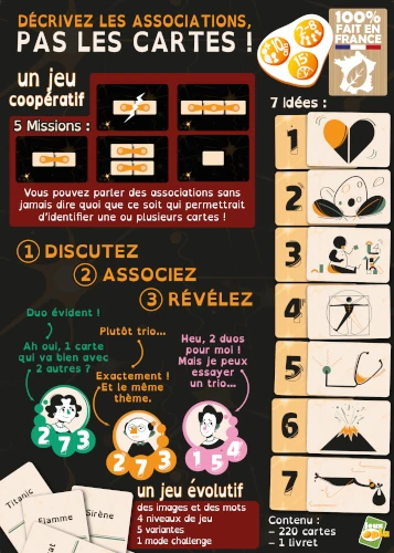 - Mise en place : À chaque manche, on dispose sur la table 7 cartes « Idée » (des images ou des mots) et plusieurs cartes « Mission » (des objectifs comme « trouver un duo », « un trio », etc.).