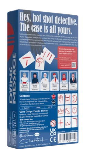 Pour communiquer, le fantôme ne peut pas parler mais dispose de 15 cartes illustrées et ambigües qu’il peut orienter ou masquer, et peut également utiliser son propre corps (en pointant, mimant une pose) pour créer un message visuel. Les détectives doivent ensuite discuter et collaborer pour interpréter ce « Dying Message » silencieux et résoudre le crime. Les joueurs peuvent choisir de collaborer ou de s’affronter.