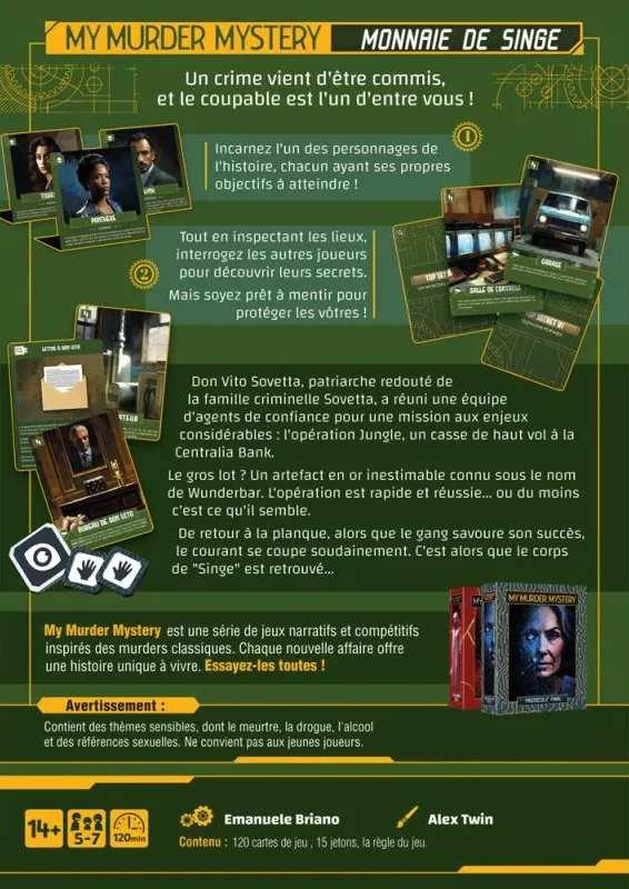 L’Univers : Un univers de film de gangsters sombre et urbain. Vous faites partie du gang du redoutable Don Vito. Après un braquage réussi où tout le monde portait des masques d’animaux, vous vous retrouvez dans votre planque. Mais la fête tourne court : une coupure de courant survient et, au retour de la lumière, le membre du gang surnommé « Singe » est retrouvé mort.
